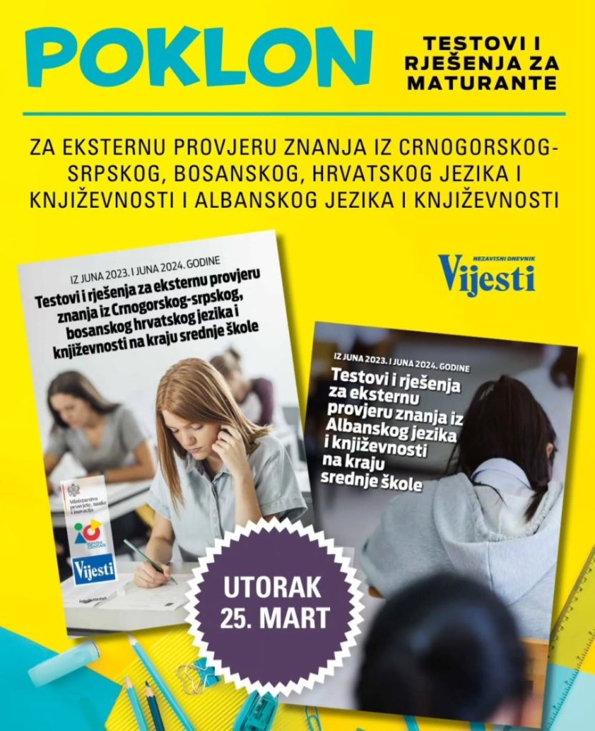Uz svaki kupljeni primjerak novine Vijesti, srednjoškolci će u utorak 25. marta dobiti testove i rješenja za eksternu provjeru znanja iz Crnogorskog-srpskog, bosanskog hrvatskog jezika i književnosti i Albanskog jezika i književnosti.